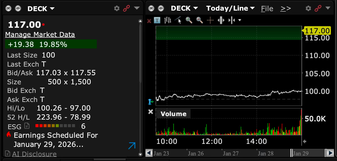 The 20% Alpha Spike: DECK shares surged in the after-hours session, a direct consequence of the market finally reconciling with the record-breaking profitability it had previously discounted even as the S&P 500 declined during regular hours and futures continued their descent overnight.