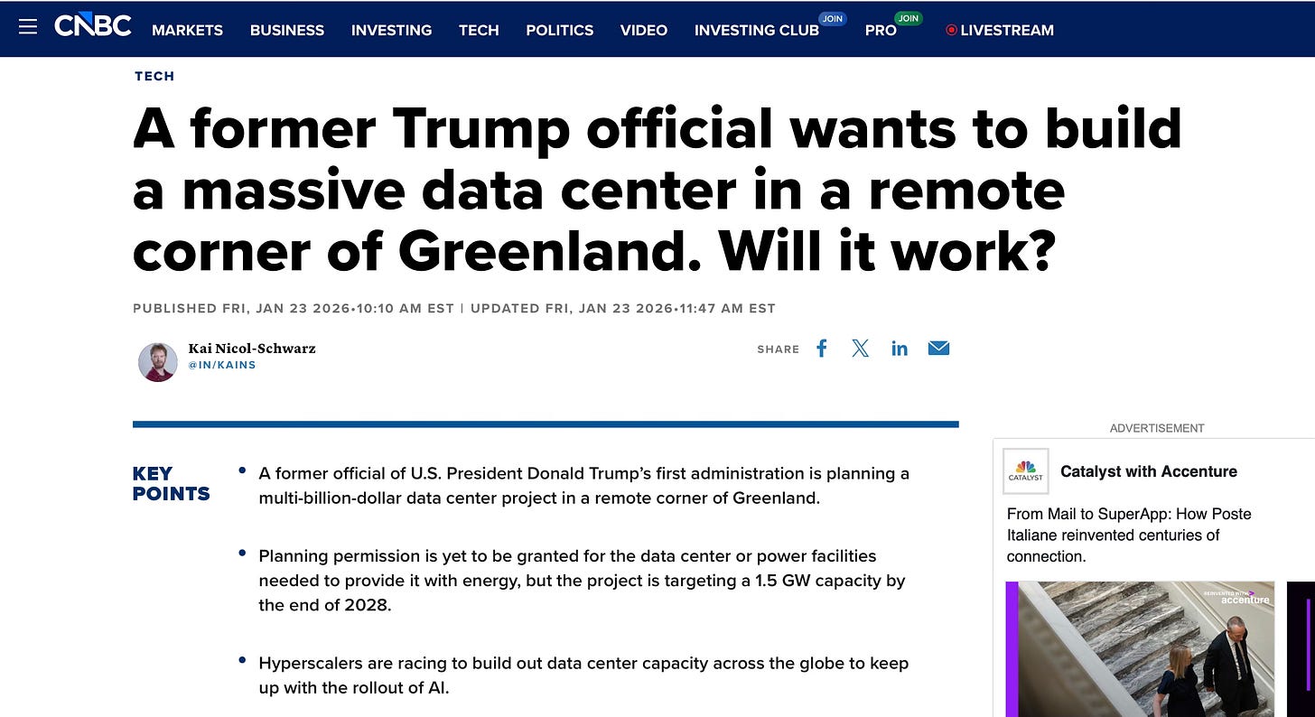 On January 23, the veil was partially torn back. CNBC confirmed the existence of a 1.5 gigawatt data center project in Kangerlussuaq, Greenland.