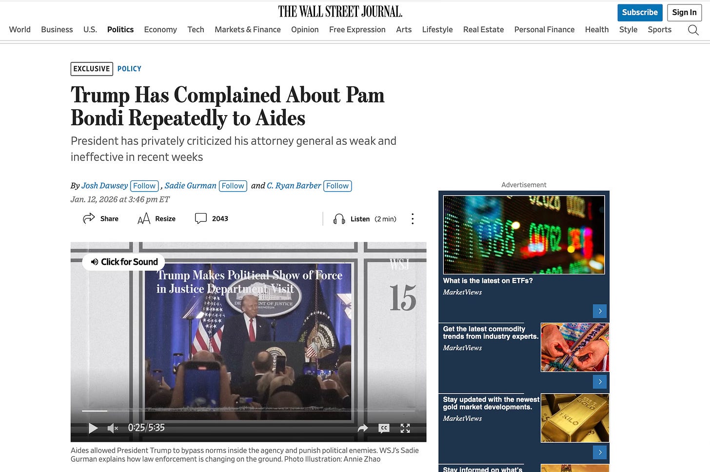 The pressure to pursue “outcome-oriented” justice has also reached a breaking point. While the President has privately berated Pam Bondi as “weak,” a predictable fate for an “Enforcer” whose primary utility was shielding a donor’s net worth (Musk), her perceived “ineffectiveness” is merely the pretext for a deeper consolidation of power.