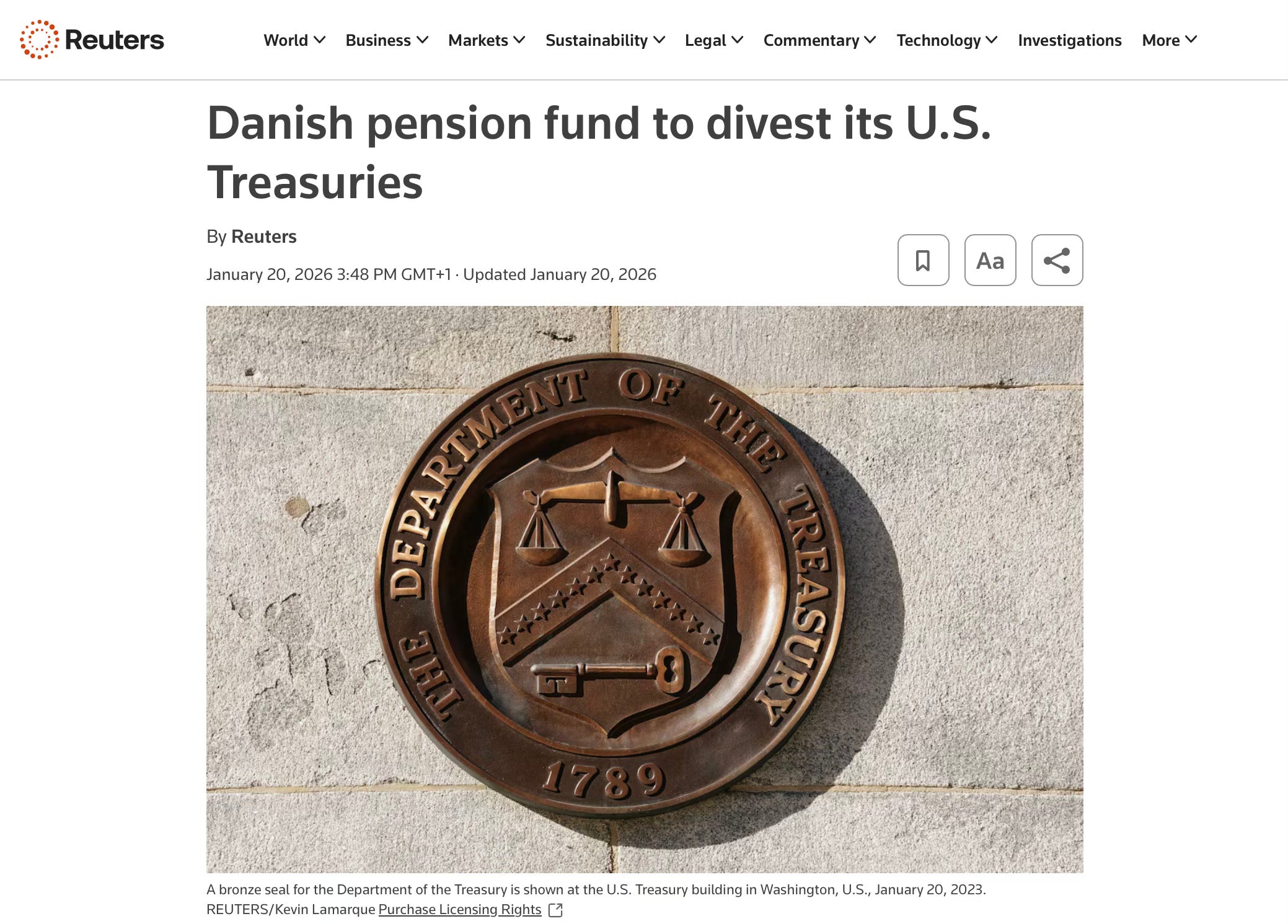 Treasury Liquidation: As of January 22, 2026, AkademikerPension has exited its $100M U.S. Treasury holdings entirely. They are likely the first domino.