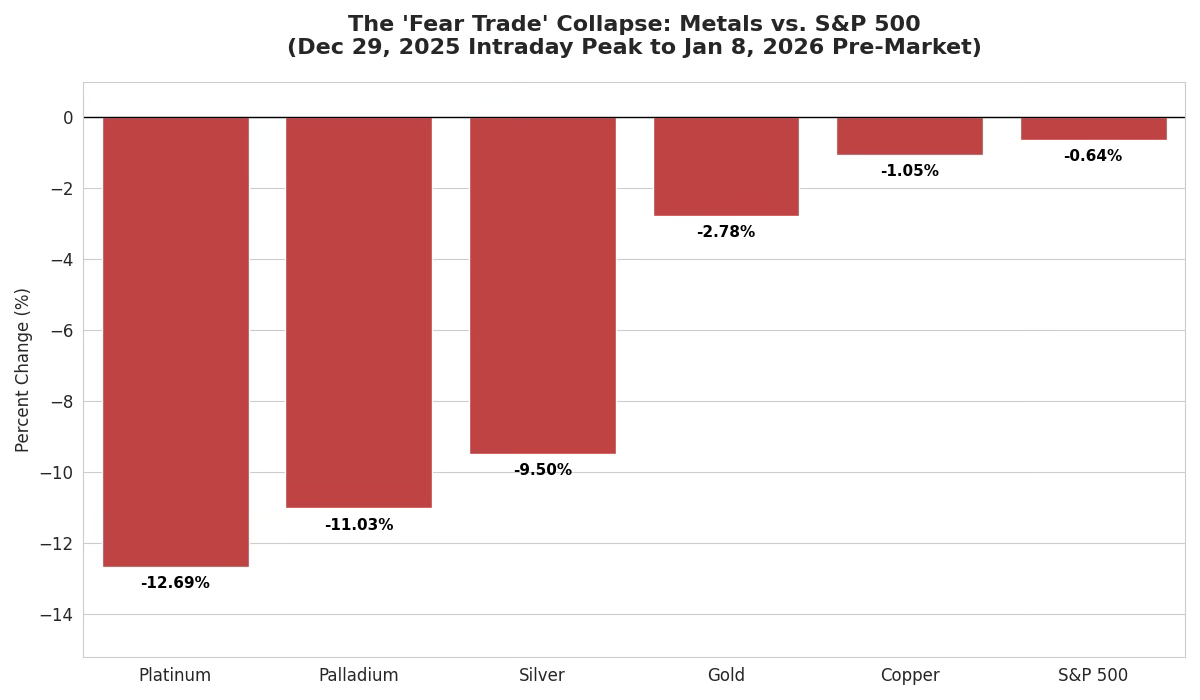 Throughout all of 2025, the herd piled into the traditional “Safe Haven” assets: Gold, Silver, and Platinum. The logic was standard: War is coming, the fiat currency is going to collapse. Buy insurance. Store value. But the market is a cruel teacher, and the lesson being taught right now is that in a liquidity crisis, there is no such thing as a safe haven.