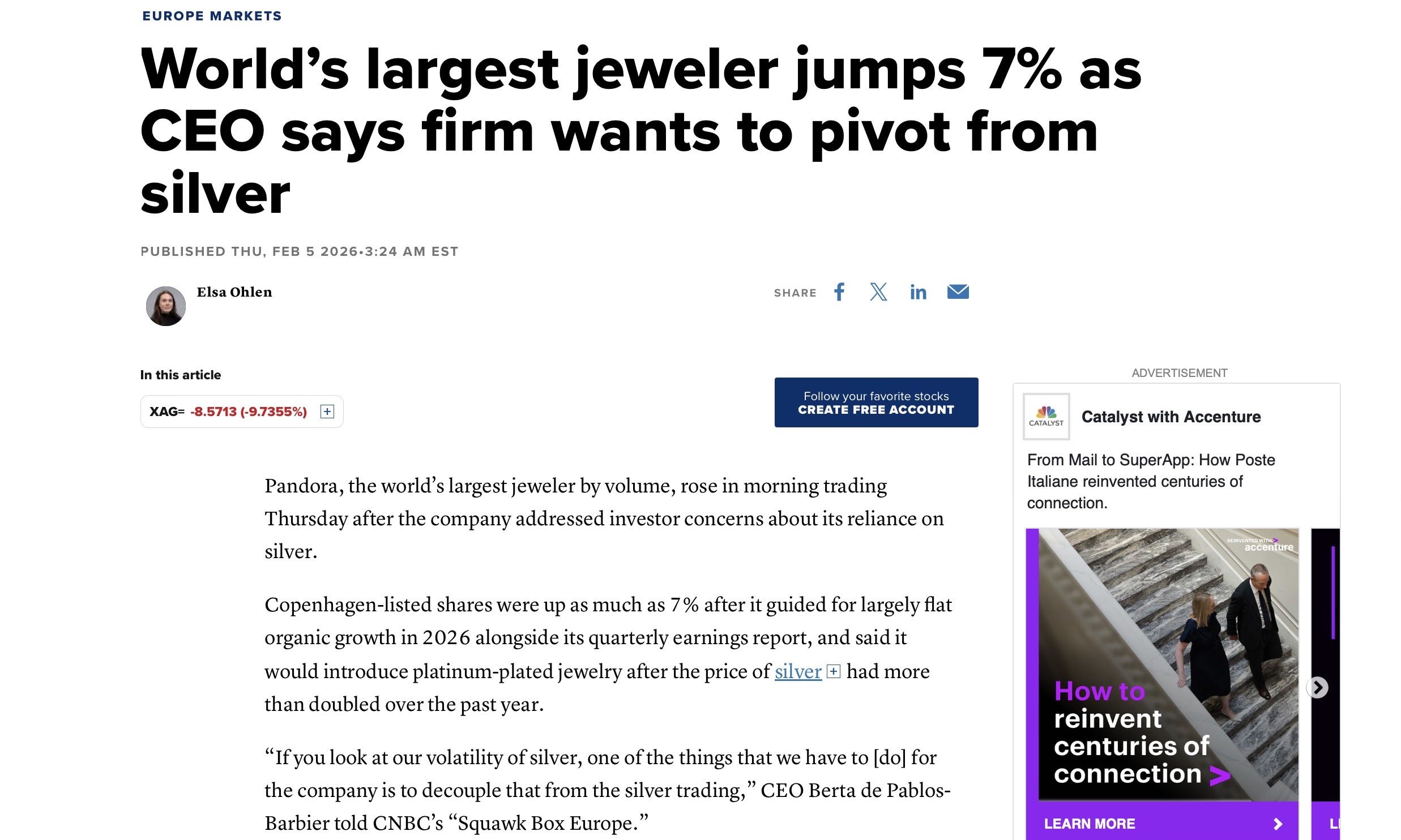 Last Thursday, February 5th, the world’s largest jeweler, Pandora, confirmed this reality with devastating precision. Faced with a surge in prices that doubled raw material costs, Pandora announced a definitive pivot: abandoning silver in favor of platinum-plated alloys. The scale of this exit cannot be overstated. Silver historically represented nearly one-third of Pandora’s cost of goods sold, making it their single largest production expense. By consuming roughly 340 tons of silver annually (approximately 6% of the global recycled market), Pandora was a pillar of industrial demand. Their strategic target is now to reduce silver’s share in their jewelry assortment from 60% down to just 25% by 2027.